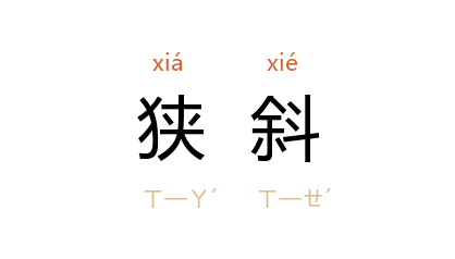 ⒉ 狭路曲巷。汉·无名氏〈长安有狭斜行〉:「长安有狭斜,道狭不容车。」狭斜处多为妓女所居,故后每喻为妓女的居所。南朝梁·沈约〈丽人赋〉:「狭斜才女,铜街丽人。」