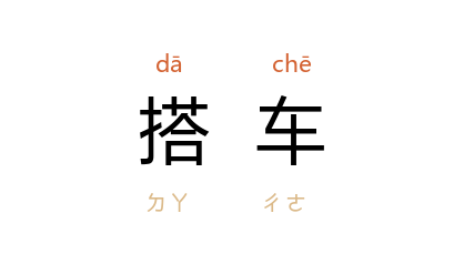 ⒉ 乘车。亦谓乘坐顺道经过目的地的车。