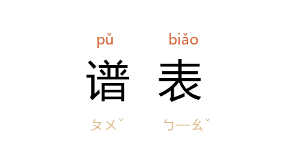 ⒈  按照事物类别或系统编成的表册。如年表、年谱、史表、史谱。参阅 唐 刘知几 《史通·表历》。