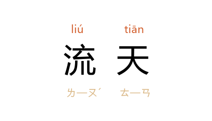 引《初学记》卷七引 晋 王彪之 《井赋》:“水带地而壤润,月流天而宵烱。”南朝 宋 谢庄 《月赋》:“白露曖空,素月流天。”宋 苏轼 《至真州再和》之一:“莫教门掩夜,坐待月流天。”明 沉鲸 《双珠记·月下相逢》:“你看流天素彩,至浄无尘。”