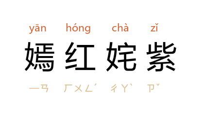 引廖仲恺 《金缕曲·题八大山人松壑图》词:“繁华歇尽何须吊!且由他,嫣红姹紫,一春收了。”冰心 《往事二》十:“亭中寂寂,浓密的松枝外,好鸟时鸣,嫣红姹紫开遍。”冯沅君 《隔绝》:“她们因为慰藉我的无聊起见,送了一瓶花来,嫣红姹紫,清香扑鼻,不过我心中的难受由此更加几倍。”