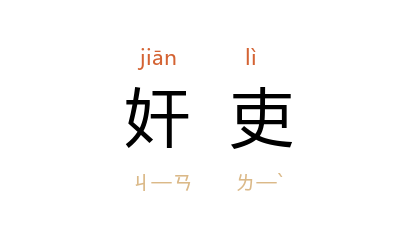 引《管子·七法》:“姦吏伤官法,姦民伤俗教。”《史记·田敬仲完世家》:“騶忌子 曰:‘谨受令,请谨脩法律而督姦吏。’”唐 李白 《武昌宰韩君去思颂碑》:“惠如春风,三月大化。姦吏束手,豪宗侧目。”《旧唐书·崔郾传》:“居内忧,释服为吏部员外。姦吏不敢欺,孤寒无援者未尝留滞,銓叙之美,为时所称。”