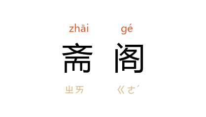 引《南齐书·豫章文献王嶷传》:“宋 元嘉 世,诸王入斋閤,得白服帬帽见人主。”《宋史·吕端传》:“端 使 高丽,暴风折檣,舟人怖恐, 端 读书若在斋閤时。”明 杨慎 《<石鼓文>序》:“先生歌一首,坿之卷尾,藏之斋阁,以无忘先生之教云。”清 冯桂芬 《<问径堂印谱>序》:“摹印书有繆篆,篆仅见於 许氏 《<説文>序》中……浸淫至於 元 明 以来,署斋阁,鎸诗词,为用滋广。”