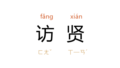 引南朝 宋 谢灵运 《撰征赋》:“褒 汉 藩之治民,并访贤以招明。”《南史·梁纪上·武帝上》:“庚午,詔分遣内侍,周省四方,观政听謡,访贤举滞。”刘绍棠 《渔火》第三章三:“反正他有求于 姚将军,必然再来 渭水 访贤。”