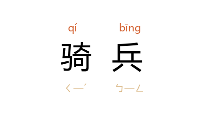 ⒈ 乘马作战的兵士。其任务为冲锋、掩护、搜索、警戒、通信等,特点为轻捷。