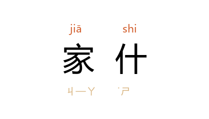 ⒈ 家庭所用的器具,如沙发、桌椅等类。也作「家具」、「家具」。
