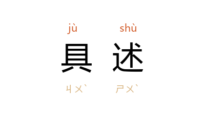 引《太平广记》卷四七四引 唐 谷神子 《博异志·木师古》:“僧徒皆惊 师古 之犹存,询其来由, 师古 具述其状,徐徐拂衣而起。”宋 周密 《齐东野语·鸱夷子见黜》:“使 子皮 居 严子陵 之上, 季真 寘 张子同 之列,则有不可者。故具述之,覬来者知予之不敢苟,而高士之尤可贵也。”
