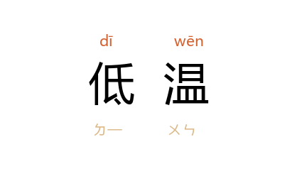 ⒈ 较常温低的气温,通常指摄氏零度左右。相对于高温而言。