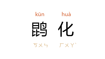 引《庄子·逍遥游》:“北冥有鱼,其名为鯤。鯤之大;不知其几千里也。化而为鸟,其名为鹏。鹏之背,不知其几千里也。”唐 李商隐 《为荥阳公桂州署防御等官牒·卢韬》:“右件官,族茂 燕臺,誉高藩閫,未从鵾化,聊屈鸞栖。”