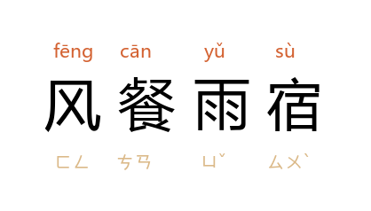 ⒈ 风中进食,雨地住宿。形容旅途或野外生活的艰辛。