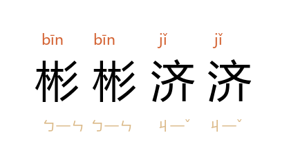 引郑观应 《盛世危言·技艺》:“而目前由学塾以陞入学院者彬彬济济,於工艺之道无不各造精微,此皆广设书院教育得宜之效也。”梁启超 《中国积弱溯源论》第四节:“其时天潢之英,从龙之彦,彬彬济济,颇不乏才。”