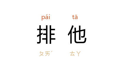引闻一多 《一个白日梦》:“健全的个人是必需的,个人发达到排他性的个人主义,却万万要不得。”郭沫若 《文艺论集·艺术的评价》:“他以少数人所能了解的艺术为排他的艺术,而不知提倡少数人所宗仰的耶教仍不外乎排他。”吕澂 《中国佛教源流略讲》第九讲:“此外‘净土教’等也是如此,广泛地容纳各派说法,没有什么排他的独特性。”