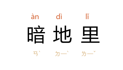 引元 无名氏 《货郎旦》第一折:“我如今暗地里央着人去与他説知。”《二十年目睹之怪现状》第八七回:“少奶奶一看病情凶险,便暗地里哀求姨妈,求他在婆婆跟前再求一个天高地厚之恩,准他昼夜侍疾。”冰心 《往事二》五:“我--更有无名的喜悦,暗地里从容的笑着。”
