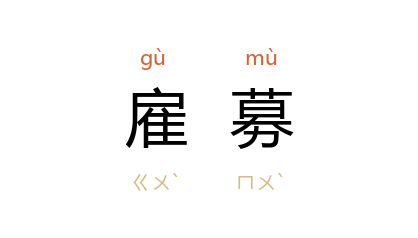 引《宋史·食货志上五》:“於是役人悉用见数为额,惟衙前用坊场、河渡钱雇募,不足,方许揭簿定差。”范文澜 《中国近代史》第二章第二节:“又据 徐广缙 说:城厢社学‘居民则以工人,铺户则以伙伴,均择其强壮可靠者充补。挨户注册,不得在外雇募’。”出钱招募。 清 严如熤 《三省边防备览·艺文下》:“铁厂、板厂、纸厂、耳菌厂皆厚貲商人出本交给厂头僱募。”