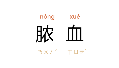 引《三国志·魏志·华佗传》:“初,军吏 李成 苦欬嗽,昼夜不寤,时吐脓血。”明 李时珍 《本草纲目·木一·枫香脂》﹝附方﹞引 朱有燉 《袖珍方》:“便痈脓血,白胶香一两,为末,入麝香轻粉少许掺之。”清 蒲松龄 《聊斋志异·促织》:“宰严限追比,旬餘,杖至百,两股间脓血流离。”