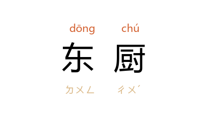 ⒈ 厨房。古制,厨房在正房之东,故称。