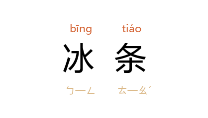 引宋 梅尧臣 《欲雪复晴》诗:“阴云不成雪,碧瓦有緐霜。日气生帘额,冰条结井牀。”清 魏源 《栈道杂诗》之五:“阴箐冰条死,阳厓日车匿。”萧红 《看风筝》一:“﹝老人﹞拖着鞋,头上没有帽子,鼻涕在胡须上结起网罗似的冰条来,纵横的网罗着胡须。”