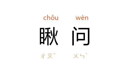 引元 无名氏 《渔樵记》第三折:“他肩将那柴担担,口不住把书赋温,每日家穿林过涧谁瞅问?”元 武汉臣 《老生儿》第四折:“那廝每言而无信,凡事惹人嗔,怕不关亲,怎将俺不瞅问?”