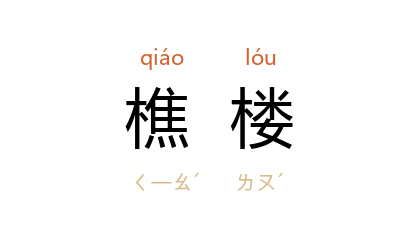 引《四游记·铁拐屡试长房》:“昨见樵楼二童对言,故知大仙来此。”《儒林外史》第十八回:“匡超人 大喜,当晚点起灯来替他不住手的批,就批出五十篇,听听那樵楼上,才交四鼓。”