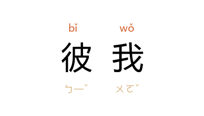 引汉 扬雄 《解嘲》:“世异事变,人道不殊,彼我易时,未知何如。”《晋书·王羲之传》:“夫庙算决胜,必宜审量彼我,万全而后动。”唐 刘知几 《史通·因习》:“及 隋氏 受命,海内为家,国靡爱憎,人无彼我。”鲁迅 《热风·随感录五十九》:“甚至彼我间的是非爱憎,也免不了得到一个相反的结果。”