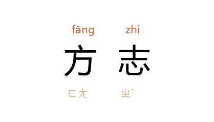 ⒈ 记述地方情况的史志。有全国性的总志和地方性的州郡府县制两类。总志如《山海经》、《大清一统志》。以省为单位的方志称“通志”,如《山西通志》,元以后著名的乡镇、寺观、山川也多有志,如《南浔志》、《灵隐寺志》。方志分门别类,取材宏富,是研究历史及历史地理的重要资料。