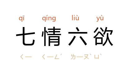 ⒈ 七情,指喜、怒、哀、惧、爱、恶、欲七种情感。六欲,指从眼、耳、鼻、舌、身、意(意念)产生的六种欲望。七情六欲总称人的情感和欲望。