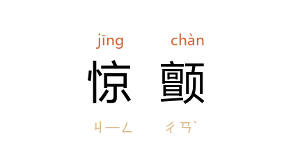 引宋 洪迈 《夷坚丁志·蛇妖》:“蛇追之,妇弃担走,未百步,惊颤而仆。”元 陈孚 《过邕州昆仑关》诗:“山童惊颤髮卓竪,劝我急勒金鞍还。”清 蒲松龄 《聊斋志异·野狗》:“李 方惊颤欲起,有一物来,兽首人身,伏嚙人首,徧吸其脑。 李 惧,匿首尸下。”王统照 《湖畔儿语》:“我听了这个话,有点惊颤了。”