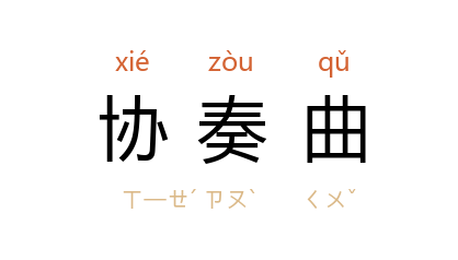⒈ 指由一个独奏者(奏小提琴、钢琴等)和一个管弦乐队合作演奏的大型器乐曲,通常由三个乐章组成。