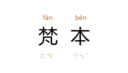 ⒈ 汉译佛经所根据的梵文本子。早期汉译佛经所根据的西域文本称为「胡本」。但在宋以后有些雕板藏经常将胡本改字作梵本。