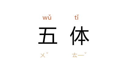 ⒈ 指《春秋》记述史事隐寓褒贬的五种手法。指汉字五种字体。篆书、八分书、真书、行书、草书。指汉字五种字体。真书、行书、草书、隶书、篆书。指四肢及头。