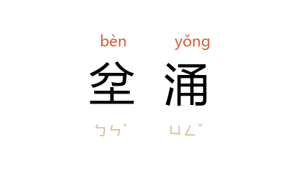引《文选·孔融<荐祢衡表>》:“飞辩骋辞,溢气坌涌。”李善 注:“坌涌,涌貌也。”前蜀 杜光庭 《司徒青城山醮词》:“顷属雨泽踰旬,泉源坌涌,丹崖翠巘。”清 恽敬 《南田先生家传》:“徐熙 下笔有芒角,生气坌涌,如云展潮行。”茅盾 《虹》五:“一些庞杂的感想,关于 韦玉 的, 柳遇春 的,和她自己父亲的,正在坌涌到 梅女士 心头。”