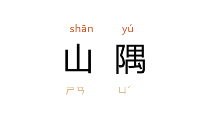引汉 司马相如 《美人赋》:“防火水中,避溺山隅。”《文选·曹植<洛神赋>》:“微幽兰之芳蔼,步踟蹰於山隅。”张铣 注:“徐步徘徊於山之隅角。”清 侯方域 《宦官论》:“昔西山之狐往见南山之虎,曰:‘子跋踄林薄之间,日一得食,何其惫也!诚能假我以皮毛与牙爪,子安坐山嵎之中,而饮食不乏。’”