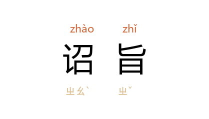 引《后汉书·周举传》:“羣臣议者多谓宜如詔旨。”宋 俞文豹 《吹剑四录》:“任法不如任人,苟非其人,虽法令昭昭,视如不见;詔旨切切,听如不闻。”清 恽敬 《<南华九老会诗谱>序》:“吾愧此名甚,无厌,是辜詔旨也。”陈白尘 《大风歌》第一部第二章:“陈平 大胆!你敢违抗先皇帝诏旨?”