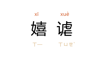 引南朝 宋 谢灵运 《善哉行》:“居德斯颐,积善嬉謔。”黄节 注:“《诗·卫风》‘善戏謔兮,不为虐兮’…… 郑玄 笺云:‘君子之德,有张有弛,故不常矜庄,而时戏謔。’”清 昭槤 《啸亭杂录·博尔奔察》:“有内大臣 博尔奔察 侍上最久,善嬉謔。”柔石 《二月》九:“她嬉谑地问:‘那末叫我此刻就回去么?还是叫我吃了饭再来呢?’”