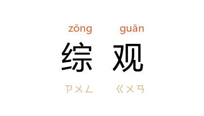 引清 陈田 《<明诗纪事己籤>序》:“综观七子之诗, 沧溟 律絶,足以弹压一世。”鲁迅 《且介亭杂文·<木刻纪程>小引》:“本集即愿做一个木刻的路程碑,将自去年以来,认为应该流布的作品,陆续辑印,以为读者的综观,作者的借镜之助。”