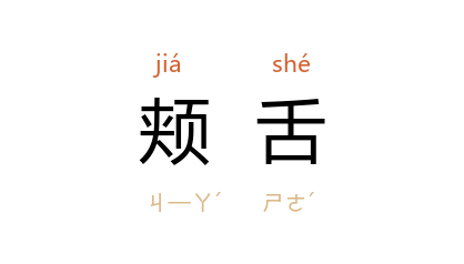 引南朝 梁武帝 《责贺琛敕》:“欺罔朝廷,空示颊舌。”《旧唐书·刘迺传》:“龙吟武啸,诚希声也,若尚颊舌之感,必下於蛙黽。”明 李贽 《列众僧职事》:“今 常融 既与众师父商议,分定职守,自然清净无事,可省颊舌之劳矣。”清 阮葵生 《茶馀客话》卷一:“亦且截截諞言,夸清班于颊舌。”