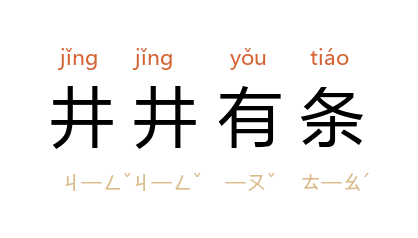 引宋 楼钥 《通邵领判范启》:“试以剧烦,井井有条而不紊。”《儒林外史》第十三回:“鲁小姐 上侍孀姑,下理家政,井井有条。”老舍 《神拳》第二幕:“万没想到你会这么细心,井井有条,一丝不紊。”