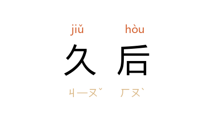 引北齐 颜之推 《颜氏家训·勉学》:“举朝惊骇,不解事义,久后寻迹,方知如此。”宋 陈亮 《汪夫人曹氏墓志铭》:“亮 復以为意方热时忽忽不自觉尔,久后固将大悔,第归熟计之。”《初刻拍案惊奇》卷三三:“纵然一时朦朧,久后自有廉明官府剖断出来。”周立波 《暴风骤雨》第二部十九:“久后生个孩子,算是贫雇农呀,还算是地主?”