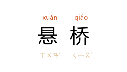 引唐 李端 《赠道者》诗:“花开深洞仙门小,路过悬桥羽节轻。”任鸿隽 《岁暮杂咏》:“我行悬桥上,万松相交并。”萧华 《南渡乌江》:“约在五十公尺高的地方,是用两根树木架成的一座悬桥。”