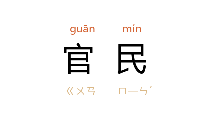 引《史记·儒林列传》:“其治官民皆有廉节,称其好学。”《后汉书·皇甫规传》:“每有征战,鲜不挫伤,官民并竭,上下穷虚。”《明史·职官志三》:“初设四夷馆隶翰林院,选国子监生习译。 宣德 元年兼选官民子弟,委官教肄,学士稽考程课。”《好逑传》第二回:“此係朝廷钦赐禁地,官民人等,俱不得至此窥探。”