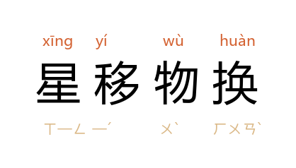 ⒈ 星辰移动,事物改变。比喻时序的变迁,世事的更迭。金·邱处机〈水龙吟·昊天空阔初晴〉词:「百年随寿仕,寒来暑往,星移物换,得高眠昼。」明·梅鼎祚也作「物换星移」。