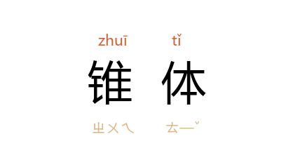 ⒈ 只有一个底面,顶点为锥状的形体。如底面为圆形的称为圆锥体,底面为三角形的称为三角锥体。