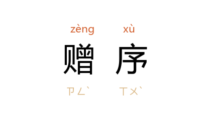 ⒈ 文体名。赠言惜别的文章。 清 姚鼐 《<古文辞类纂>序言》:“赠序类者, 老子 曰:君子赠人以言。 颜渊、子路 之相违,则以言相赠处, 梁王 觴诸侯於 范臺,鲁君 择言而进,所以致敬爱陈忠告之谊也。