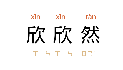 引《孟子·梁惠王下》:“百姓闻王鐘鼓之声,管籥之音,举欣欣然有喜色。”汉 荀悦 《汉纪·昭帝纪》:“欣欣然发愤忘食,日新其德。”唐 李复言 《续玄怪录·薛伟》:“既出郭,其心欣欣然,若笼禽槛兽之得逸,莫我知也。”鲁迅 《呐喊·鸭的喜剧》:“他们便欣欣然,游水,钻水,拍翅子,‘鸭鸭’的叫。”