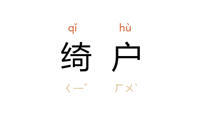 引唐 元稹 《生春》诗之十七:“何处生春早,春生綺户中。”宋 苏轼 《水调歌头·丙辰中秋欢饮达旦大醉作此篇兼怀子由》词:“转朱阁,低綺户,照无眠。”元 张宪 《白苧舞词》:“璚窗綺户锁风色,桃树日长蝴蝶飞。”