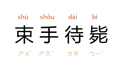 ⒈ 把手绑起来等待死亡。比喻危难时不想办法解决,坐等败亡。也作「敛手待毙」。