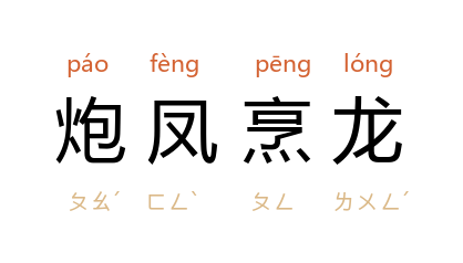 亦作“炮龙烹凤”。 《水浒传》第八二回:“堂上堂下,皆列位次,大设筵宴……虽无炮龙烹凤,端的是肉山酒海。”