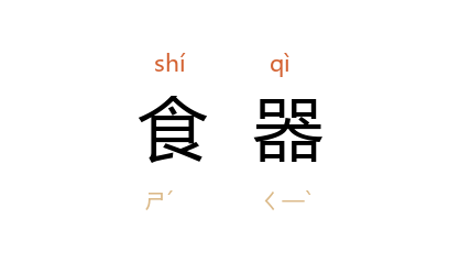 引《礼记·少仪》:“食器不刻鏤。”《后汉书·西域传·大秦》:“宫室皆以水精为柱,食器亦然。”唐 刘存 《事始》:“韩子 曰:‘ 舜 作食器,黑漆其上。’”