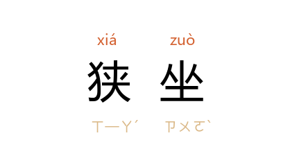 引《管子·弟子职》:“后至就席,狭坐则起。”尹知章 注:“狭坐之人见后至者则当起。”汉 张衡 《西京赋》:“促中堂之狭坐,羽觴行而无筭。”一本作“陿”。 唐 李贺 《嘲少年》诗:“美人狭坐飞琼觴,贫人唤云天上郎。”叶葱奇 注:“狭坐,犹促坐。”
