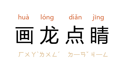 引《历代名画记·卷七·梁》。后用以比喻绘画、作文时在最重要之处加上一笔,使全体更加生动传神。明·张鼐〈读卓吾老子书述〉:「夫一古人之书耳,有根本者下笔鉴定,则为画龙点睛;无根本者妄意标指,则为刻舟记剑。」亦比喻做事能把握要点。《儿女英雄传·第三〇回》:「这日安太太吩咐他给岳父母顺斋,原不过说了句『好好儿的弄点吃的』,他就这等山珍海味的小题大作起来,还可以说画龙点睛。」